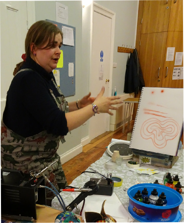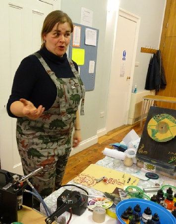 Tic Challis gave us very interesting evening showing us lots of things about air brush painting. She showed us exercises to get to grip with the basic techniques. She then showed how to spray patterns through cut outs and how to stop other parts being affected. She also showed how to take a pen apart and how to put it back together. Thank you Tic for a very interesting evening I am sure that some of us will want to have a go.