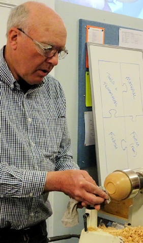 Peter Nicholls started by giving us some ideas about how we should plan a project before starting on the lathe. He listed, design shape, wood selection, tools, and finishing as things worth thinking about before starting the turning. He then followed up by turning a number of small items to illustrate the importance of the project plan. I think that we all learnt something from his demonstration. Thank you Peter for your evening.